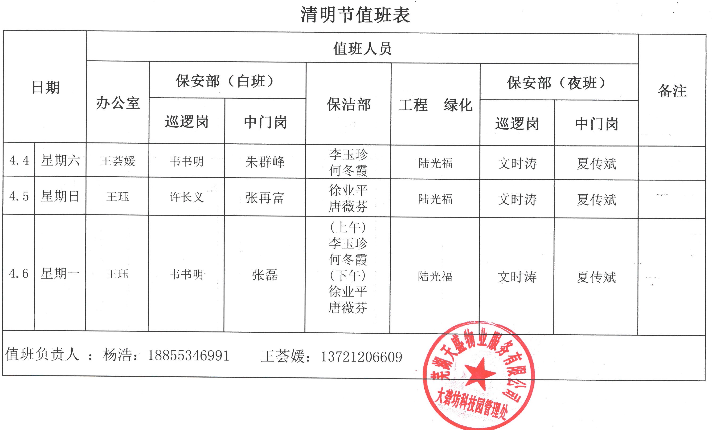 4.各企業在放假期間如需加班,請報送至我公司物業后勤部眭婷處(QQ:231678798,微信:15955317886,電話:0553-5791890),便于突發情況緊急聯系。