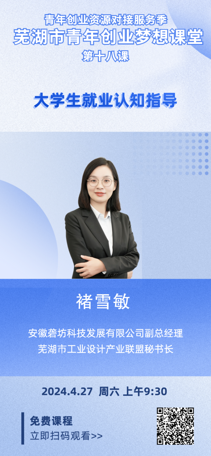 4月27日上午,“源來好創(chuàng)業(yè)”青年創(chuàng)業(yè)資源對接服務(wù)季——蕪湖市青年創(chuàng)業(yè)夢想課堂第十八課正式播出。本次是由安徽礱坊科技發(fā)展有限公司副總經(jīng)理,蕪湖市工業(yè)設(shè)計(jì)產(chǎn)業(yè)聯(lián)盟秘書長褚雪敏帶來的《大學(xué)生就業(yè)認(rèn)知指導(dǎo)》課程。