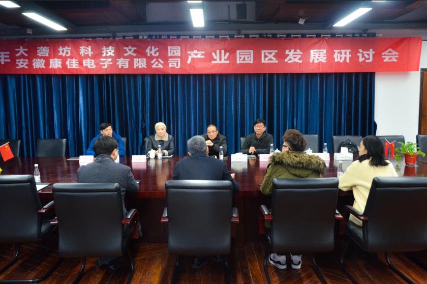 11月26日,安徽康佳電子有限公司黨委副書記、副總經理張可青,營運管理中心總監王萬葉,康佳科創公司行政總監馬泉山等領導來園開展產業園區發展研討會,園區黨委書記、總經理卞國琛陪同參觀。安康公司一行先后參觀園區消費體驗中心、園區企業純米科技、國科生物、澤萌網絡、訊飛幻境等。